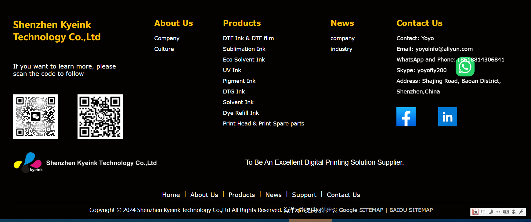 Shenzhen Kyeink Technology Co.,Ltd is a professional manufactuer of inkjet products and printing solutions in China. Main products include DTF ink, sublimation ink, eco solvent ink, uv ink, solvent ink and desktop printer ink.