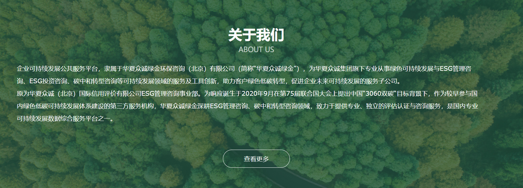 原为华夏众诚(北京)国际信用评价有限公司ESG管理咨询事业部。为响应诞生于2020年9月在第75届联合国大会上提出中国“3060双碳“目标背景下,作为较早参与国内绿色低碳可持续发展体系建设的第三方服务机构,华夏众诚绿金深耕ESG管理咨询、碳中和转型咨询领域,致力于提供专业、独立的评估认证与咨询服务,是国内专业可持续发展数据综合服务平台之一。