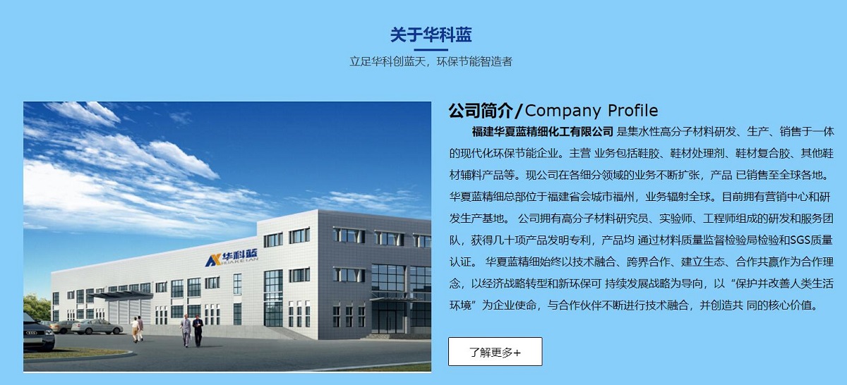 福建华夏蓝精细化工有限公司 是集水性高分子材料研发、生产、销售于一体的现代化环保节能企业。主营 业务包括鞋胶、鞋材处理剂、鞋材复合胶、其他鞋材辅料产品等。现公司在各细分领域的业务不断扩张,产品 已销售至全球各地。